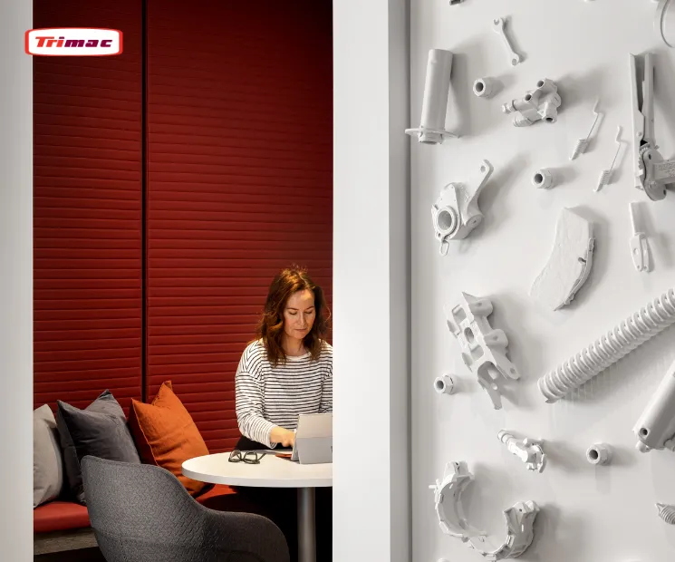La façade du camion + le mur des pièces détachées : Afin de rapprocher les équipes du bureau et celles sur la route, un imposant camion Freightliner aux couleurs emblématiques de Trimac accueille tous ceux qui entrent. À proximité de l’espace de collaboration principal, de véritables pièces de camion Trimac sont intégrées dans le design, fusionnant harmonieusement l’identité de l’entreprise avec l’environnement de travail.
