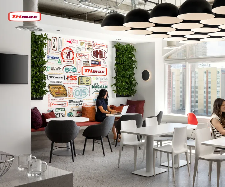 Logo Wall: An ode to Trimac’s presence in North America, a dedicated wall in the café catalogs the constellation of some of the companies, both past and present, that collectively form Trimac today.