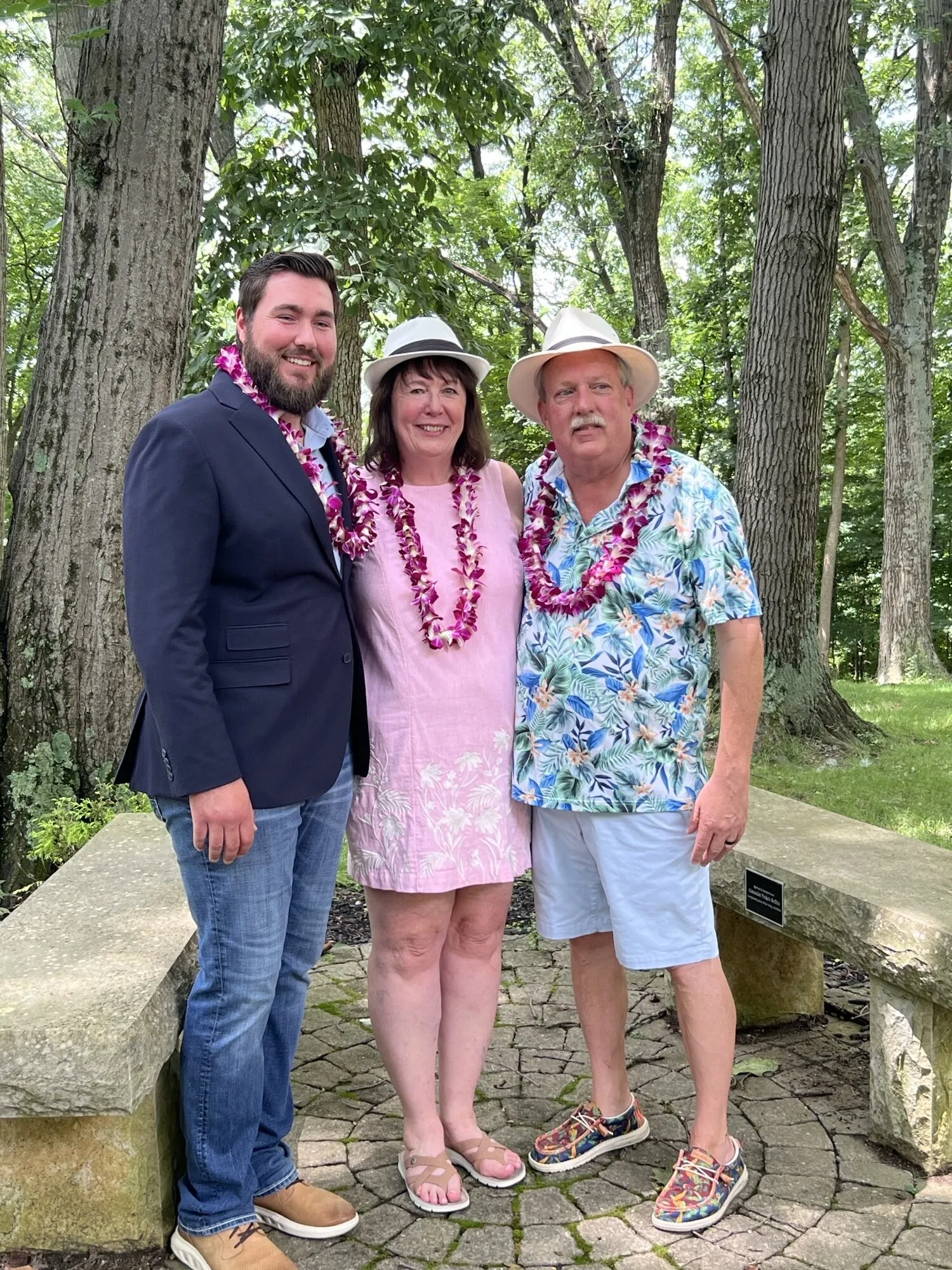 Bert and Sally exchanged vows in a vibrant Hawaiian-themed ceremony at Tawawa Park in Sidney, Ohio, surrounded by family, close friends and colleagues. In true island style, guests swapped formalwear for shorts, Hawaiian shirts and floral prints, while the newlyweds wore authentic Hawaiian leis. Far from the plastic version you’d find at a party store, the purple and white orchid leis were flown in directly from Honolulu thanks to the bride’s personal connections and delivered fresh the day before the wedding.